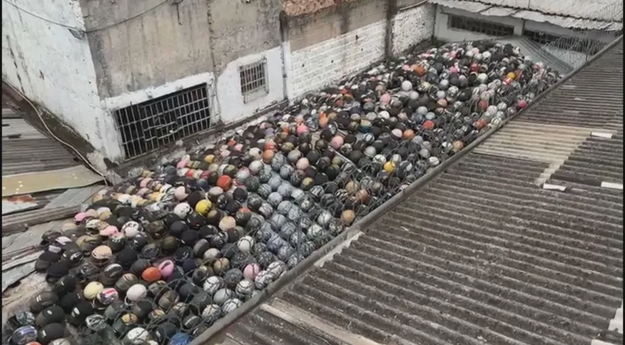 Na mesma ocasião, foi registrada uma imagem que chamou a atenção nas redes sociais. Os policiais encontraram cerca de 2 mil capacetes no telhado de um prédio onde funciona uma loja de peças para motocicletas, presos por uma espécie de rede. O Deic investiga a situação e tenta descobrir se os objetos pertencem a vítimas que tiveram suas motos roubadas.