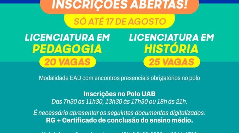 O Polo UAB de Tapejara comunica que as inscrições para os cursos de Licenciatura em PEDAGOGIA e Licenciatura em HISTÓRIA estão abertas até o dia 17 de agosto. Ofertados em parceria com o Instituto Federal Sul-rio-grandense (IFSUL), os cursos são GRATUITOS e na modalidade EaD com ENCONTROS PRESENCIAIS OBRIGATÓRIOS NO POLO.