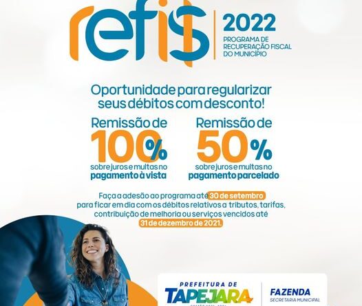 A Secretaria da Fazenda, através do Programa de Recuperação Fiscal – Refis, oferece oportunidades para que os munícipes possam estar em dia com os débitos relativos a tributos, tarifas, contribuição de melhoria ou serviços vencidos até 31 de dezembro de 2021. As adesões terminam em 30 de setembro de 2022.