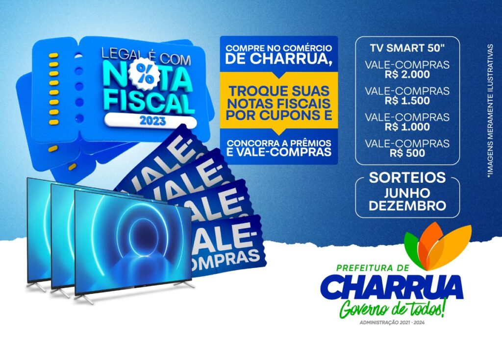 Com o objetivo de valorizar e incentivar a emissão da nota fiscal e aumentar a arrecadação de tributos no comércio do Município de Charrua, foi lançada a campanha “Legal é com Nota Fiscal 2023”, ação onde os consumidores de Charrua podem trocar suas notas fiscais de compra de produtos e serviços e concorrer a prêmios e vale-compras.