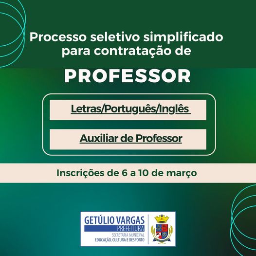 A Prefeitura de Getúlio Vargas informa que que realizará Processo Seletivo Simplificado para contratação temporária de excepcional interesse público de Professor de Letras/Português/Inglês e de Auxiliar de Professor, formação de cadastro reserva.