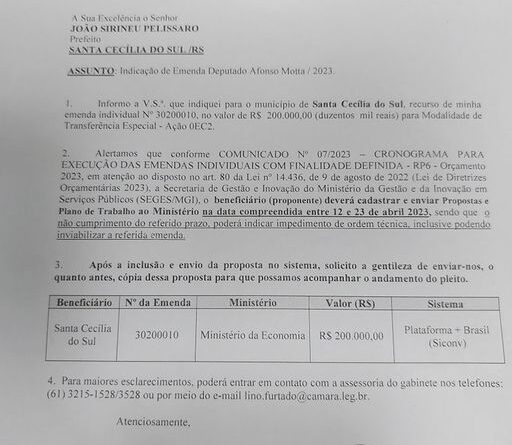 Prefeitura de Santa Cecília do Sul recebe indicação de R$ 200 mil de Emenda Individual do Deputado Afonso Motta