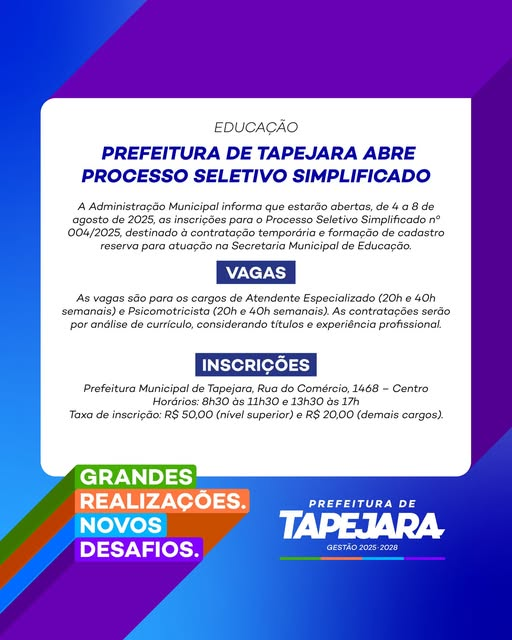 A Administração Municipal informa que estarão abertas, de 4 a 8 de agosto de 2025, as inscrições para o Processo Seletivo Simplificado nº 004/2025, destinado à contratação temporária e formação de cadastro reserva para atuação na Secretaria Municipal de Educação.