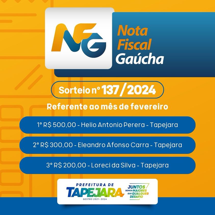 A Prefeitura de Tapejara através da Secretaria da fazenda divulga os ganhadores da Nota Fiscal Gaúcha do mês.