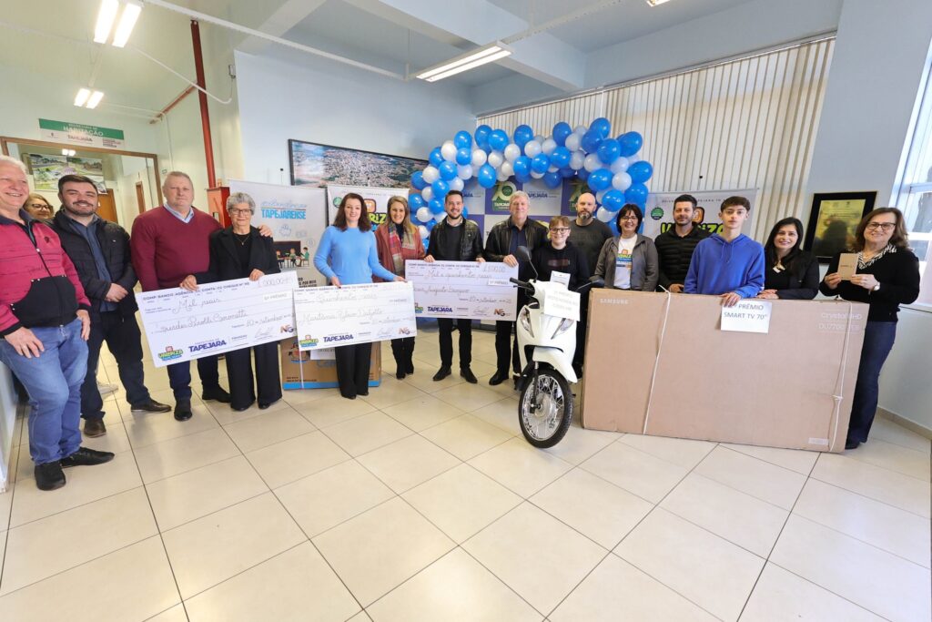 A Prefeitura de Tapejara, por meio da Secretaria de Finanças, realizou na quarta-feira (10), no Centro Administrativo Municipal Padre Raimundo Damin, a entrega dos prêmios do primeiro sorteio principal da campanha Valoriza Tapejara Digital 2025. O ato contou com a presença dos ganhadores, servidores municipais, vereadores, secretários e do prefeito Evanir Wolff (Big).