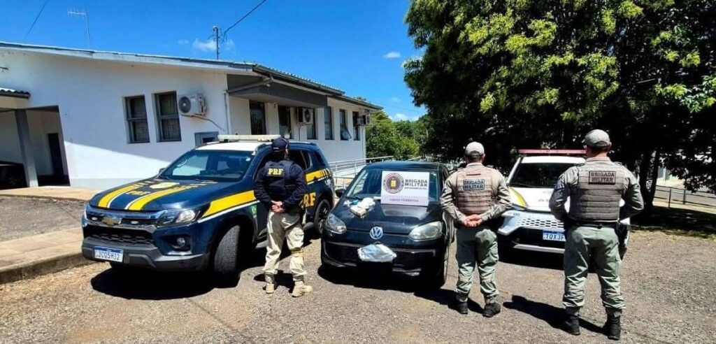 Com apoio da Brigada Militar, os policiais retornaram ao trajeto percorrido e localizaram os materiais jogados pelo suspeito. Foram encontrados dois pacotes com aproximadamente 1,9 quilo de cocaína e um aparelho celular quebrado.