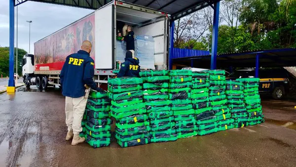 Os policiais entraram na câmara fria e encontraram fardos de droga escondidos entre os paletes de congelados. A carga somou 1.124 quilos. Fiscais do Mapa deram apoio na verificação da carga.