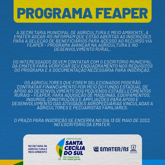 A Secretaria Municipal de Agricultura e Meio Ambiente de Santa Cecília do Sul, a Emater ASCAR-RS informam que estão abertas as inscrições para a seleção de beneficiários para acesso ao recurso via FEAPER – PROGRAMA AVANÇAR na Agricultura e no Desenvolvimento Rural..Os interessados devem contatar com o Escritório Municipal da Emater para verificar seu enquadramento nos requisitos do Programa e a documentação necessária para inscrição..Os agricultores que forem selecionados poderão contratar financiamento por meio do Fundo Estadual de Apoio ao Desenvolvimento dos Pequenos Estabelecimentos Rurais – Feaper, para aquisição de máquinas, equipamentos, insumos, construções e ampliações para apoio e desenvolvimento das atividades agropecuárias vinculadas a agricultores e pecuaristas familiares..
