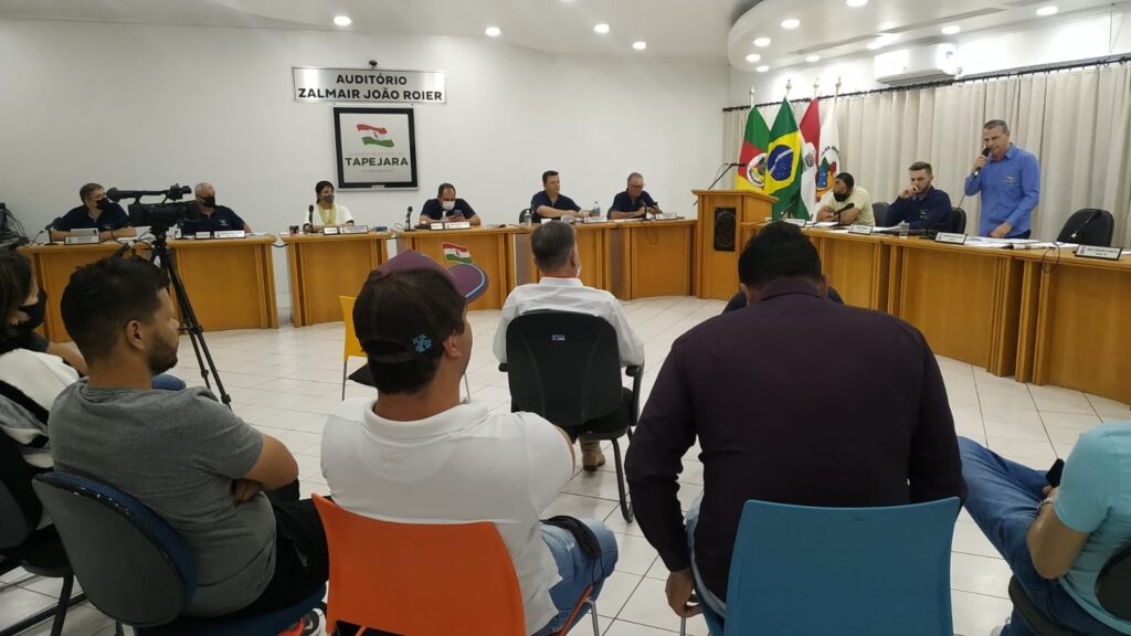 Na noite de segunda-feira, dia 25 de outubro de 2021, na Sala de Sessões Zalmair João Roier Alemão, foi realizada a 34ª Sessão Ordinária da Câmara de Vereadores de Tapejara, presidida pelo senhor Déberton Fracaro o (Betinho) do PDT, pois o Sr. Eduardo de Oliveira do (PSB) não estava apto a continuar a sessão por problema na voz.O Vereador Celso Piffer do (Cidadania), reassumiu sua cadeira no Legislativo após trinta e um dias afastado. Estiveram presente na sessão os representantes da empresa ALPHA AUTOCENTER LTDA, pois o Projeto de Lei do executivo Nº 070/21 que estava em votação, autoriza a Concessão de Direito Real de uso de Imóveis de propriedade do Município de Tapejara e foi aprovada por unanimidade.A sessão ordinária contou com a apreciação e votação de três Projetos de Lei do Executivo, um Projeto de Resolução e dois Requerimentos. Confira:- Requerimento nº 036/2021. O Presidente da Câmara de Vereadores Carlos Eduardo de Oliveira, juntamente com os vereadores abaixo subscritos, em conformidade com o que estabelece o artigo nº 122 e artigo nº 168 do Regimento Interno da casa, REQUER a inclusão imediata na Ordem do dia da Sessão Ordinária do dia 25 de outubro, dos Projetos de Lei do Executivo n° 073 e 74/2021.- Requerimento nº 037/2021. Os Vereadores da situação, Bancadas do PP, PDT e PSB, no uso de suas legais e regimentais atribuições, vem por meio deste requerer a Mesa Diretora dessa Casa Legislativa, que envie convite para a equipe da Urgência e Emergência, para falarem sobre a Urgência e Emergência do Hospital Santo Antônio de Tapejara-Rs. Os convidados terão os 15 (quinze) minutos previstos no artigo 205 do Regimento Interno, para que façam uso da palavra, e, após suas explanações, seja concedido para cada uma das cinco Bancadas, o direito a uma pergunta e resposta, tendo 3 (três) minutos de tempo.- Projeto de Lei do Executivo nº 070/2021. Autoriza a Concessão de Direito Real de uso de Imóveis de propriedade do Município de Tapejara.- Projeto de Lei do Executivo nº 073/2021. Inclui nova Ação na Relação Cadastral de Ações da Lei nº 4504 de 06 de outubro de 2020, que dispõe sobre as Diretrizes Orçamentarias para o exercício de 2021, de acordo com a Lei Federal nº 14017/20 e autoriza abertura de Crédito Especial e dá outras providências. – Projeto de Lei do Executivo nº 074/2021. Inclui a Campanha NATAL ESPERANÇA PREMIADO 2021, dentro do Programa Valoriza Tapejara. – Projeto de Resolução nº 001/2021. Altera a redação do Artigo 24; acrescentar inciso IV ao Artigo 96; Alterar a redação do Artigo 150; acrescentar § 1º e § 2º do Artigo 156, todos do Regimento Interno da Câmara Municipal de Vereadores de Tapejara-RS.