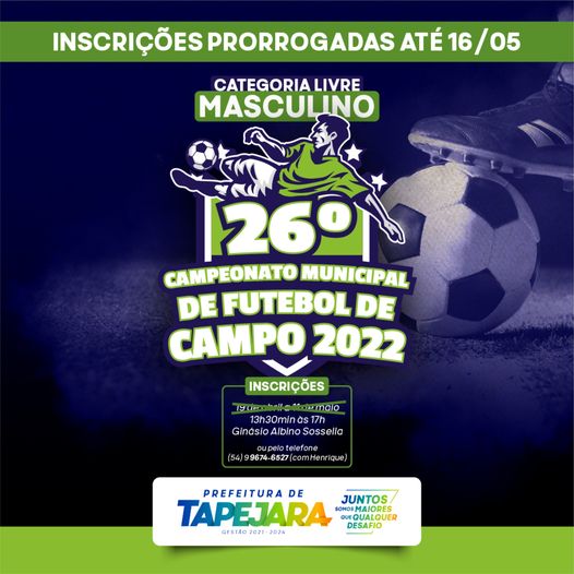 Foram prorrogadas, até o dia 16 de maio, as inscrições para o 26º Campeonato Municipal de Futebol de Campo 2022. A data para início da competição, que terá disputas na categoria Livre Masculino, será divulgada nos próximos dias.