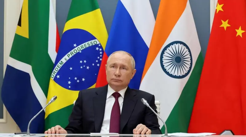 Vladimir Putin participou da 15ª Cúpula do Brics por videoconferência, em tempo real, de Moscou. Ele desistiu de viajar à África do Sul porque estava ameaçado por uma ordem de prisão do Tribunal Penal Internacional, que deveria ser cumprida caso ele pisasse em solo sul-africano.