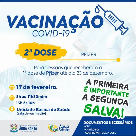 Quarta-feira, 17 de fevereiro, haverá vacinação de 2ª DOSE da vacina PFIZER para quem fez a 1ª dose em até 23 de dezembro.