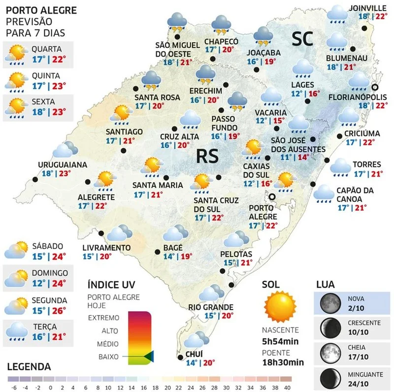 No Noroeste e no Norte gaúcho, chance alta de chuva por vezes forte com trovoadas e ocasionais temporais isolados. Chove muito também em diversos pontos de Santa Catarina.