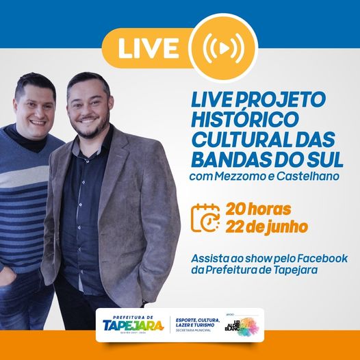 Nesta quarta-feira (22), a partir das 20h, acompanhe, aqui, na página da Prefeitura de Tapejara, a live apresentada pela dupla Mezzomo e Castelhano. Na oportunidade, os cantores irão prestar uma homenagem às bandas do Sul. O evento conta com apoio da Lei Aldir Blanc e da Secretaria Municipal de Esporte, Cultura, Lazer e Turismo. Não perca!