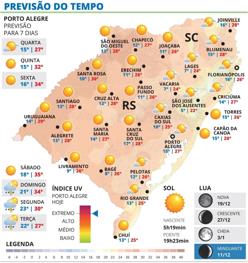 Muitas cidades gaúchas devem ter mínimas nesta quarta-feira, 17, entre 10ºC e 13ºC, baixas para esta época do ano. Marcas inferiores a 10ºC podem ocorrer na Campanha, Serra do Sudeste, Planalto Médio e na Serra Gaúcha. Na Grande Porto Alegre, alguns pontos podem ter apenas 12ºC a 14ºC nas madrugadas desta quarta e da quinta-feira, 18. No final da semana, porém, retorna o calor mais intenso típico desta época com forte a intenso calor durante a tarde.
