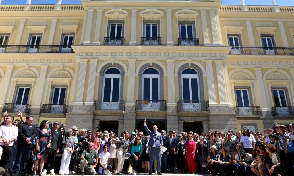 A cerimônia de entrega da fachada contou com autoridades nacionais e representantes de entidades internacionais envolvidas na reconstrução do prédio histórico. “Isso demonstra que o Museu Nacional vive e vive graças a vocês, que de mãos dadas nos ajudam a reconstruir essa instituição. E, sublinhando que Museu Nacional pertence à sociedade brasileira e, sim, a sociedade brasileira deve participar da sua reconstrução”, enfatiza o diretor do museu, Alexander Kellner.