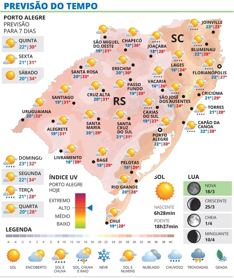 As temperaturas não sobem de forma acentuada, mas se mantém levemente acima da média para esta época do ano. Os maiores registros são esperados em municípios da Fronteira com a Argentina e no Noroeste do estado.