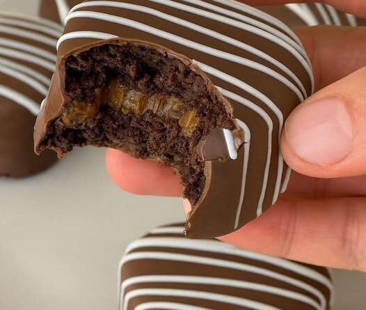 Recheie com doce de leite e banhe no chocolate. Decore com listras de chocolate branco.