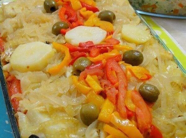 Em uma travessa grande, faça camadas de batata, bacalhau, cebola, pimentão e azeitona