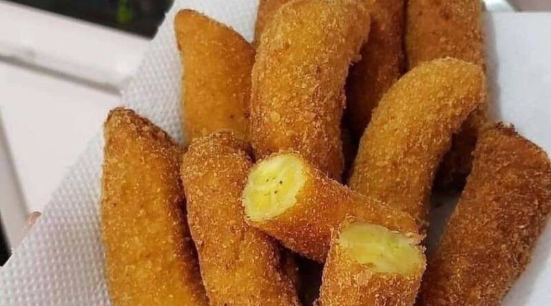 Em seguida, descasque as bananas, corte cada uma ao meio e passe pela farinha de trigo, depois pela mistura do leite com os ovos e então pela farinha de rosca.