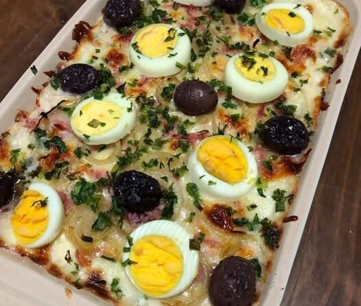 🥔Deixe por uns 15 min até a mozarela começar a derreter e retire do forno para colocar os ovos cozido em rodelas e azeitonas.