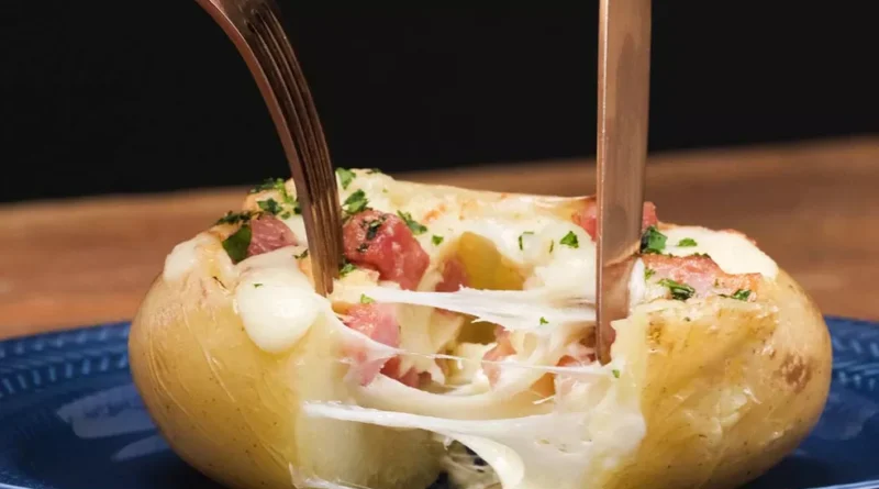 6. 6. Corte a parte de cima das batatas, retire o miolo e acrescente o recheio.