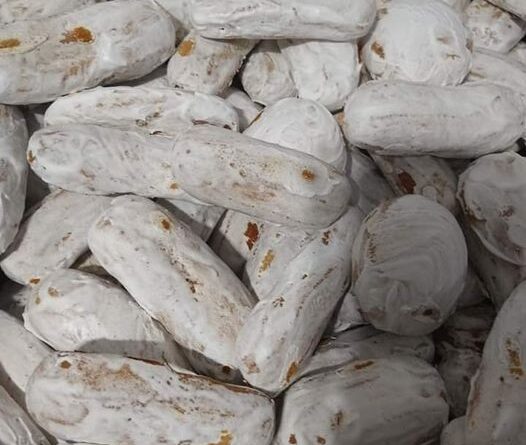 Após assada, passar glacê, utilizando as claras reservadas com duas xícaras de açúcar aquecidos em banho Maria. Bater com batedeira até ficar bem firme. Passar o mesmo nas bolachas.