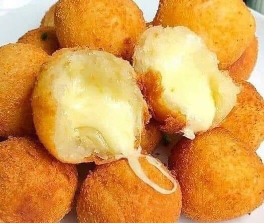 Corte o queijo em quadradinhos não muito grandes. Pegue a massa com uma colher não muito cheia coloque na mão, abra, coloque o queijo. Faça bolinhas frite em óleo quente.