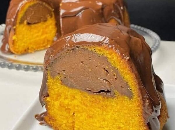 Bolo: em um liquidificador acrescente as cenouras em pedaços + os ovos + o óleo + o açúcar. Bata tudo muito bem e acrescente a farinha de trigo e misture com um fuê. Finalize com o fermento em pó. Unte uma forma de 20 cm de diâmetro com manteiga e farinha de trigo e acrescente a metade da massa, depois coloque o recheio em colheradas e o restante da massa por cima. Leve ao forno pré aquecido a 180 graus por aproximadamente 45-50 minutos.