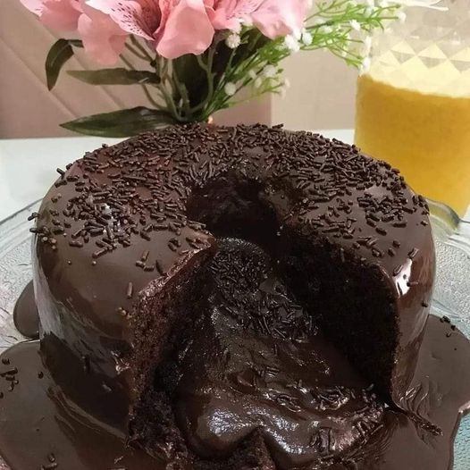 Molha O bolo, joga a cobertura eu jogo quente mesmo e o granulado