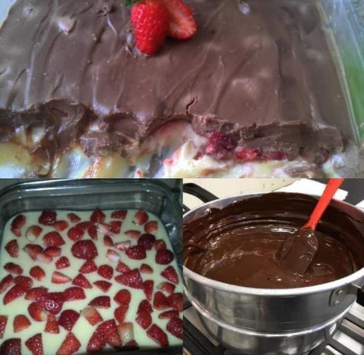 Depois acrescente 1 lata de creme de leite e mexa, reserve este creme no pirex. Deixe esfriar e coloque os morangos por cima. Derreta em banho-maria o chocolate e misture o creme de leite. Jogue por cima dos morangos. Leve à geladeira.