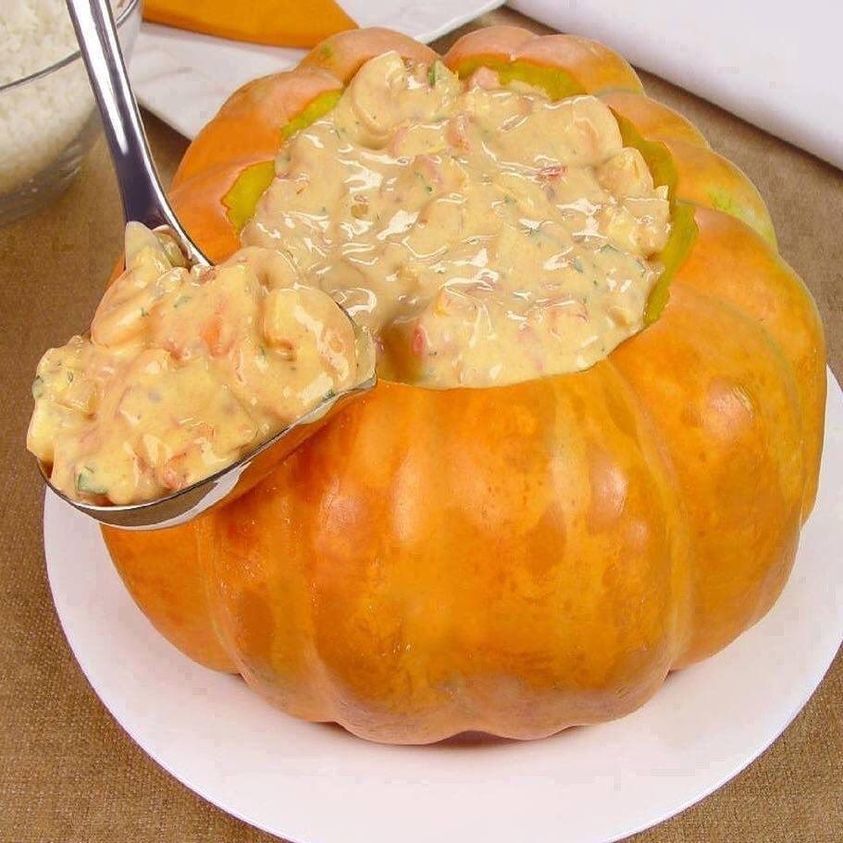 Forre o fundo da moranga com Catupiry, despeje o refogado e cubra com o restante do Catupiry. Coloque em uma forma e leve ao forno alto, preaquecido, por 15 minutos. Sirva acompanhado de arroz branco.