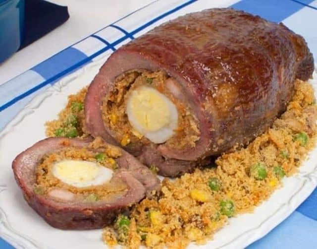 Para a farofa, aqueça uma panela com a manteiga, em fogo médio, e frite o bacon até dourar. Junte o alho, a cenoura, o milho, a ervilha e refogue por 3 minutos. Adicione a farinha, sal, orégano e desligue. Abra a peça de maminha com uma faca até formar uma manta. Tempere com o alho, sal e pimenta. Espalhe parte da farofa sobre a carne, ajeite os ovos cozidos e enrole como rocambole. Amarre com barbante e coloque em uma fôrma untada. Regue com azeite, cubra com papel alumínio e leve ao forno médio, preaquecido, por 40 minutos. Retire o papel, espalhe a manteiga sobre a carne e volte ao forno por 30 minutos ou até dourar. Retire, corte em fatias e sirva com a farofa restante e pronto.