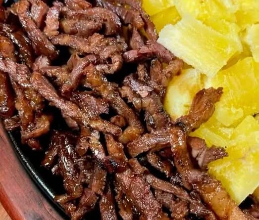 1. Monte tudo em uma travessa ou chapa quente, colocando a carne acebolada e a mandioca lado a lado.