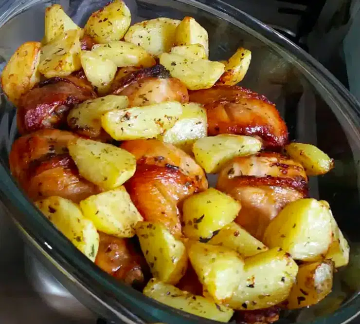 Note que as batatas serão cozidas com o caldo que irá soltar do frango, então, na metade do tempo, vire as coxas assadas e as batatas.