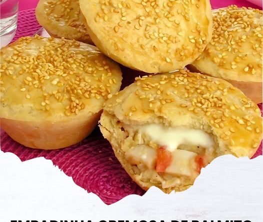 Para o recheio, em uma panela, derreta a manteiga e refogue a cebola por 2 minutos. Adicione a farinha dissolvida na água da conserva do palmito, mexendo até engrossar.
