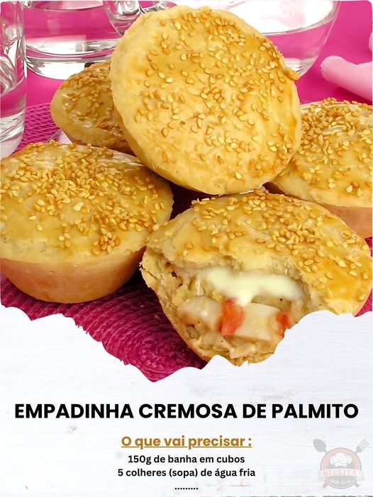 Para o recheio, em uma panela, derreta a manteiga e refogue a cebola por 2 minutos. Adicione a farinha dissolvida na água da conserva do palmito, mexendo até engrossar.
