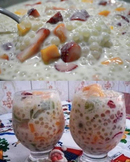 Escorra o sagu e depois coloque novamente na panela o leite de coco e deixe ferver. Espere esfriar e coloque o leite condensado e as frutas picadas e o creme de leite se preferir. Leve para geladeira por umas 2 horas e prontinho!