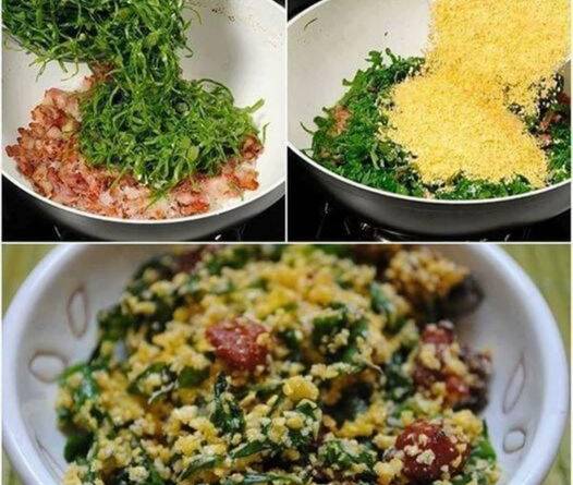 Deixe aquecer um pouco e sirva a seguir. A farofa fica úmida, se quando adicionar a farofa pronta a farofa de couve ficar muito seca, coloque um pouco mais de água, o quanto achar necessário.