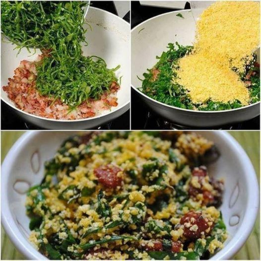 Deixe aquecer um pouco e sirva a seguir. A farofa fica úmida, se quando adicionar a farofa pronta a farofa de couve ficar muito seca, coloque um pouco mais de água, o quanto achar necessário.