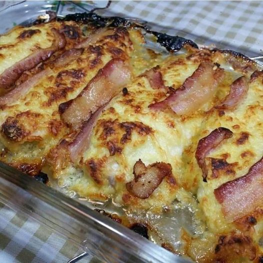Por cima coloque 1 fatia de bacon. Coloque em um refratário e leve ao formo por 20 a 30 minutos, até ficar dourado.