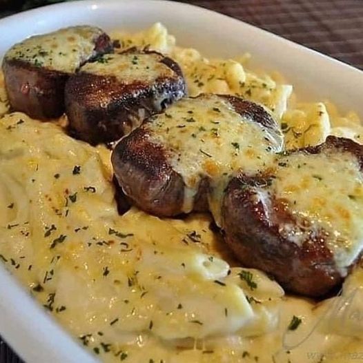 Coloque o macarrão já cozido ao dente e Despeje o creme de queijo ,coloque os medalhões de filé mignon por cima. sirva que o seu filé mignon ao molho quatro queijos está pronto.