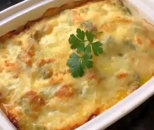 – Em uma travessa que possa ir ao forno coloque o brócolis (se for fresco pode ser colocado cru, mas se for congelado, como no meu caso, de uma aferventada rápida para tirar o gelo) e por cima despeje a massa. De uma misturada e distribua fatias de muçarela por cima.