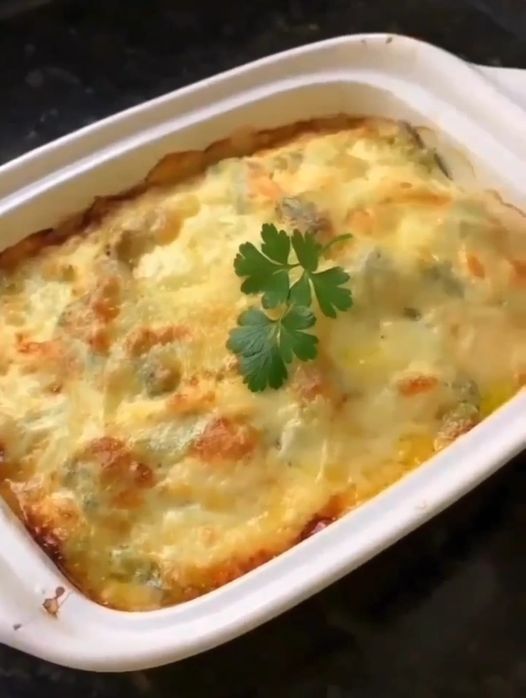 – Em uma travessa que possa ir ao forno coloque o brócolis (se for fresco pode ser colocado cru, mas se for congelado, como no meu caso, de uma aferventada rápida para tirar o gelo) e por cima despeje a massa. De uma misturada e distribua fatias de muçarela por cima.