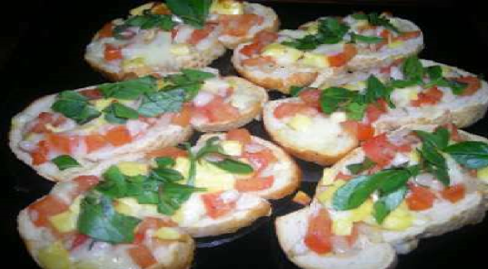 - Retire a assadeira com as fatias de pão do forno e cubra cada uma das fatias primeiro com o tomate refogado e depois com o queijo.