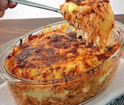 Em um refratário médio untado, intercale camadas de refogado, de batata, de refogado e
