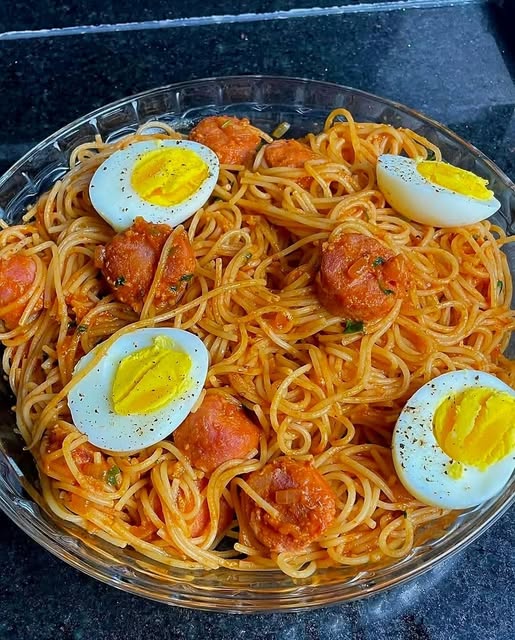 Coloque o macarrão em uma travessa e decore com os ovos cozidos por cima.
