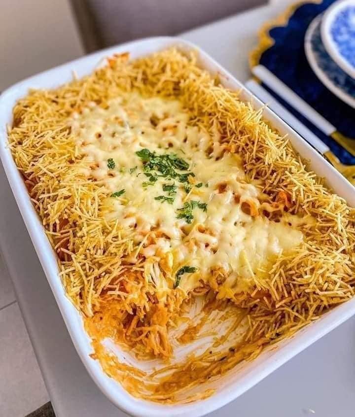 Em um refratário coloque o macarrão, queijo ralado à gosto ou mussarela e leve no forno para gratinar por 10 min a 180C°, depois decorei com batata palha!