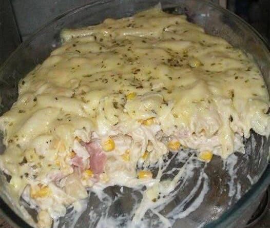 Depois coloque uma camada de queijo e todo o presunto. Coloque o resto do macarrão, outra camada do queijo mussarela e por cima um pouco de queijo ralado. Colocar no forno para gratinar.