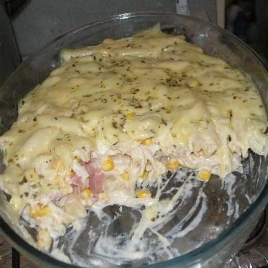 Depois coloque uma camada de queijo e todo o presunto. Coloque o resto do macarrão, outra camada do queijo mussarela e por cima um pouco de queijo ralado. Colocar no forno para gratinar.